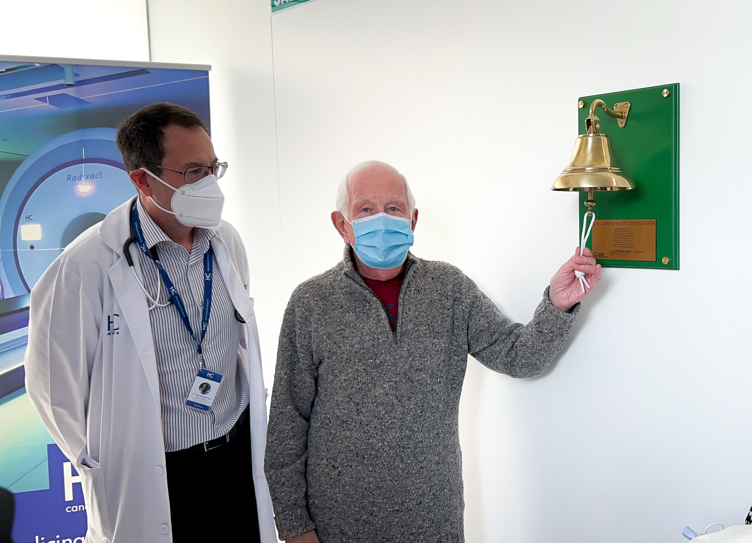El primer paciente es hacer sonar la campana en HC Cancer Center ha sido Geoffrey Pegg que tras su última sesión de radioterapia quiso compartir el momento con el equipo de oncología haciendo tocar la campana. Una campana que espera ser tocada por muchos pacientes más.